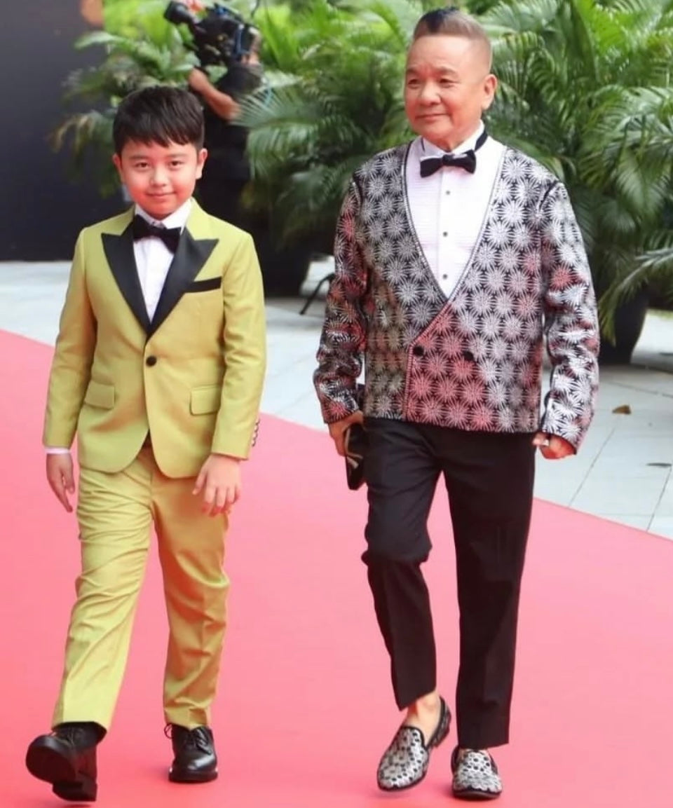 Crafted specifically for Nathaniel, this eye-catching pastel lime green tuxedo features a striking black satin peak lapel that perfectly balances playful elegance with sophistication.